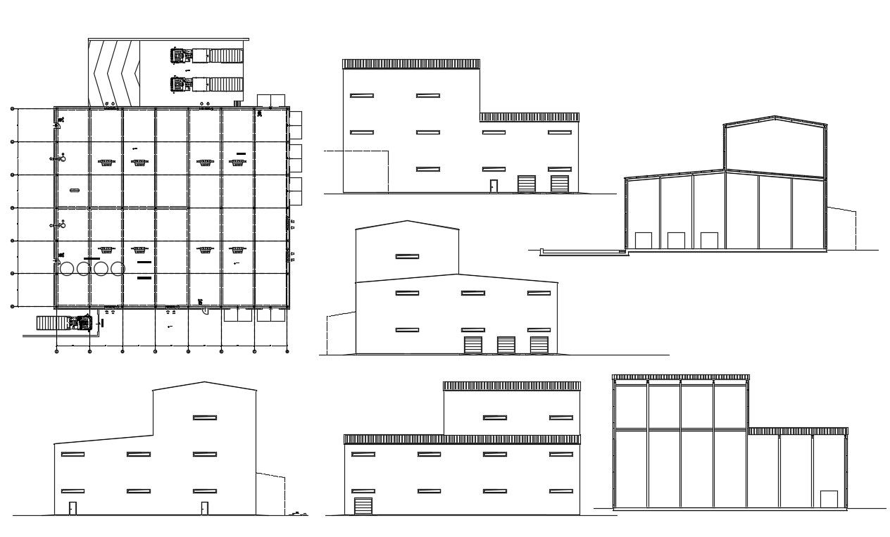 Factory Building Elevation design DWG File includes; top view plan and all side elevation design that shos wall and terrace roof design.
