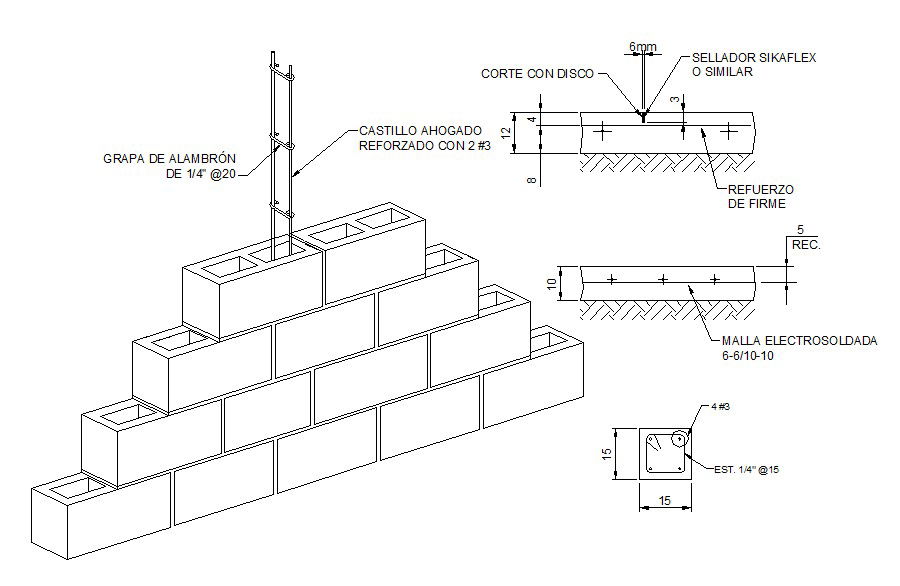 Brick masonry wall construction detail drawing that shows the construction details of wall along with brick bonds and cement mortar, reinforcement details.