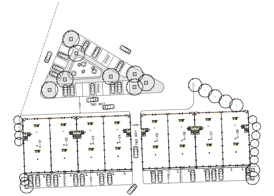 Download Building Site Plan DWG File; the layout plan includes building blocks with parking detail, in this drawing use car blocks for improving CAD presentation.