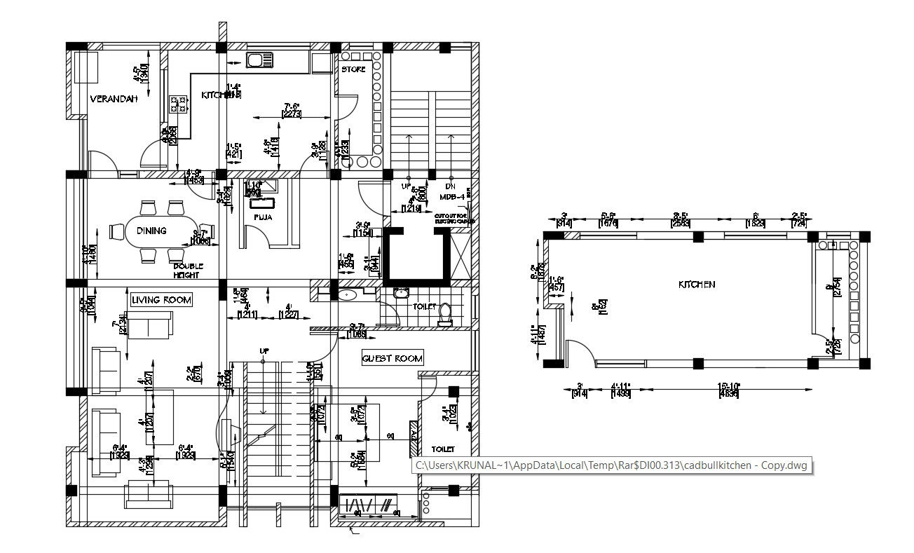 Multi-Storey House Design Which includes bedroom, dining room washroom, living room kitchen, the guest room and with kitchen dimension detail.