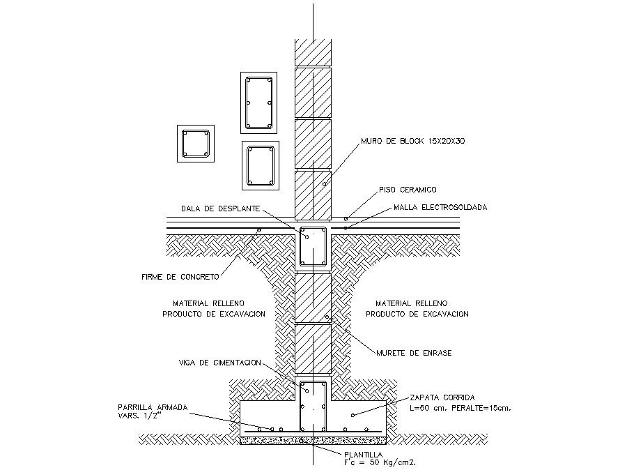 Foundation Footing detail CAD structural drawing that shows the foundation footing construction detail along with reinforcement and concrete masonry work details.