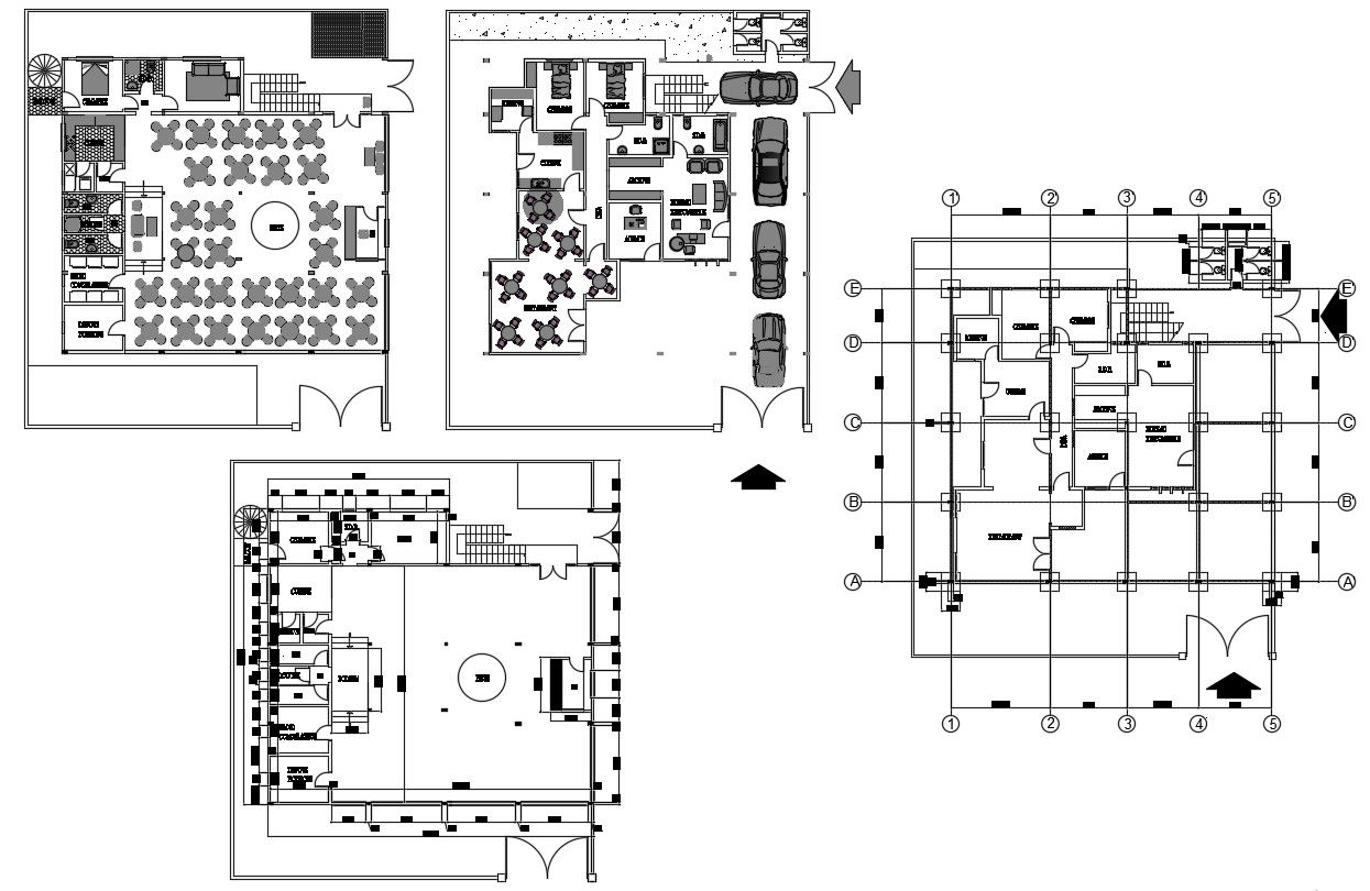 Restaurant Plan Drawing AutoCAD file includes layout plan, and foundation plan shows dining area, office cabins, and bathroom with furniture and dimension details.