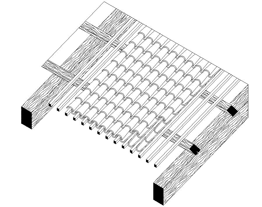 Roof design CAD drawing that shows isometric view of roof truss along with roofing material details and other structural details of roofing structure.
