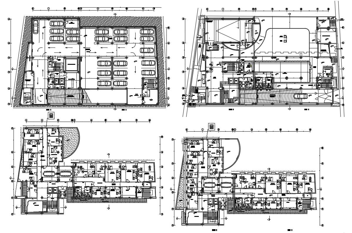 Office Building Plans DWG File; the architecture layout plan of basement parking floor plan, workstation office floor plan with furniture details.