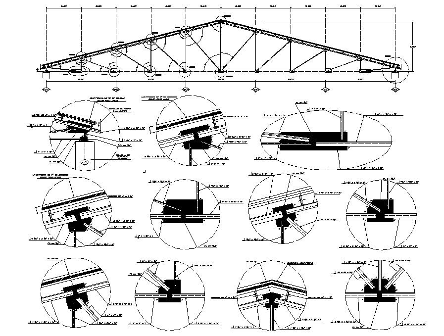 Roof truss purlin detail CAD drawing that shows roofing structure construction details along with principal rafter details, main sag tie details, angle sections details, joints and connections details and other structural blocks details also presented in drawing.