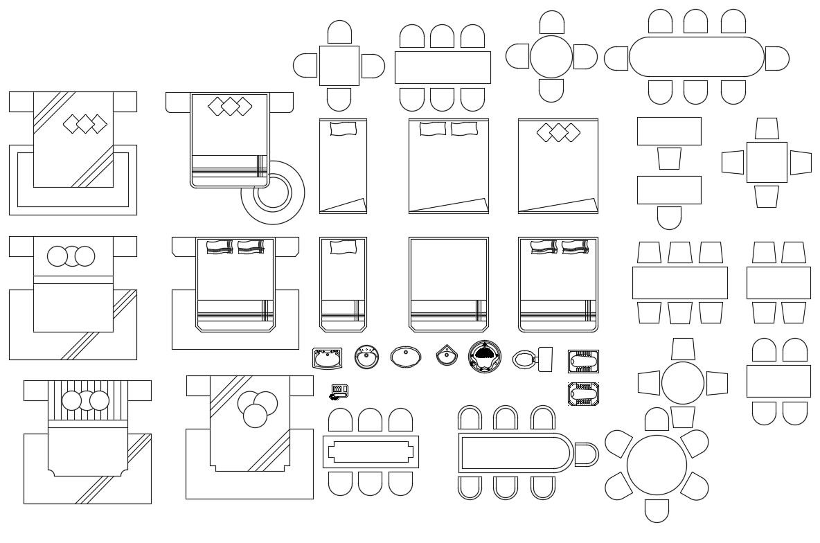 Furniture CAD Blocks DWG file includes different types of furniture like a double bed, single bed, sanitary ware, and dining table.