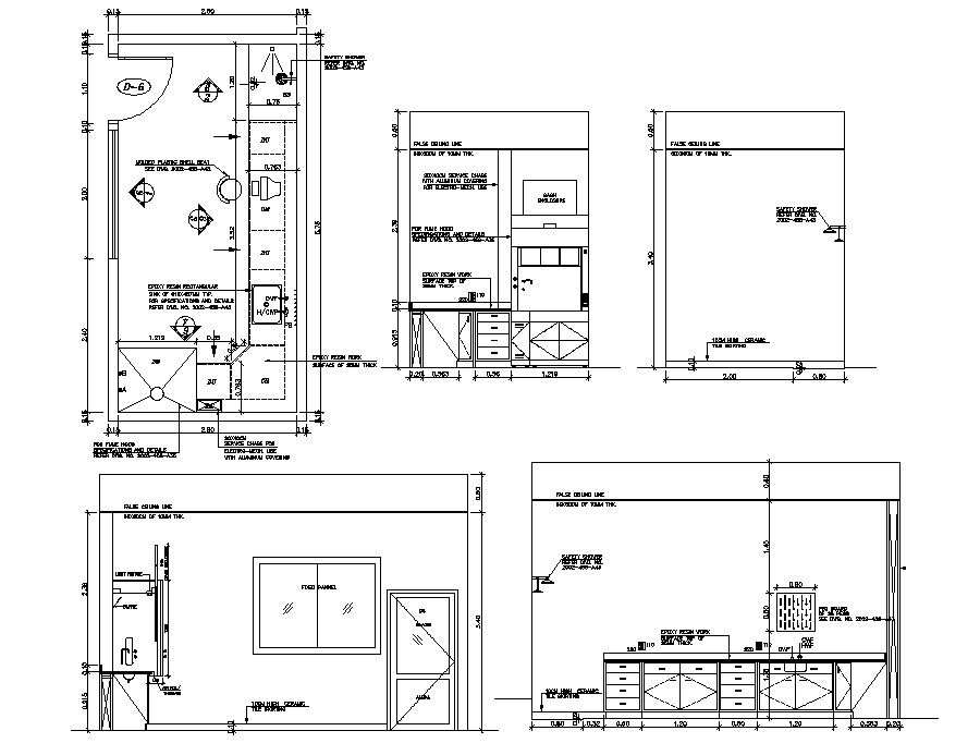 Plan and elevation design of kitchen that shows furniture blocks and automation details in kitchen of cabinet shelves, kitchen sink, Window units, pantry area etc.