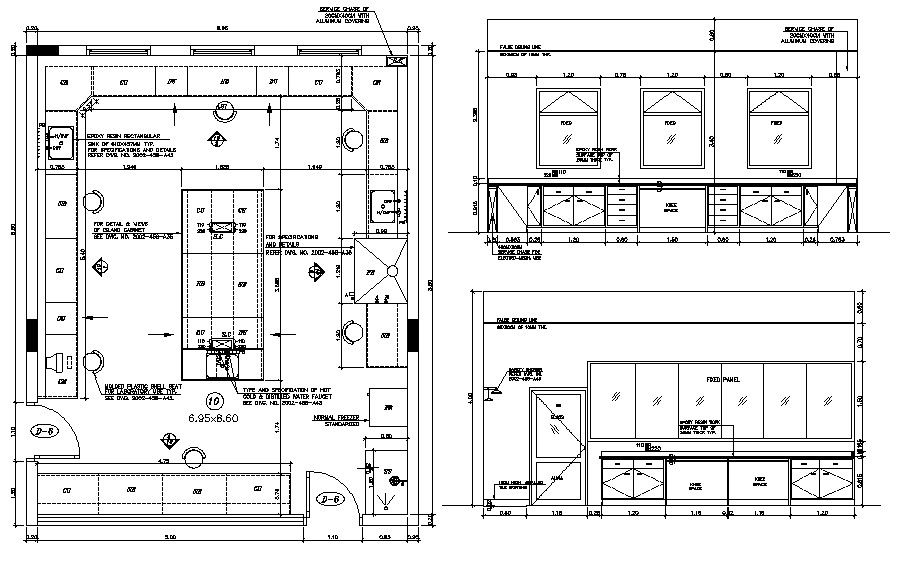 CAD plan design of kitchen layout drawing that shows the furniture layout and automation blocks details along with room dimension details and elevation drawing of kitchen.