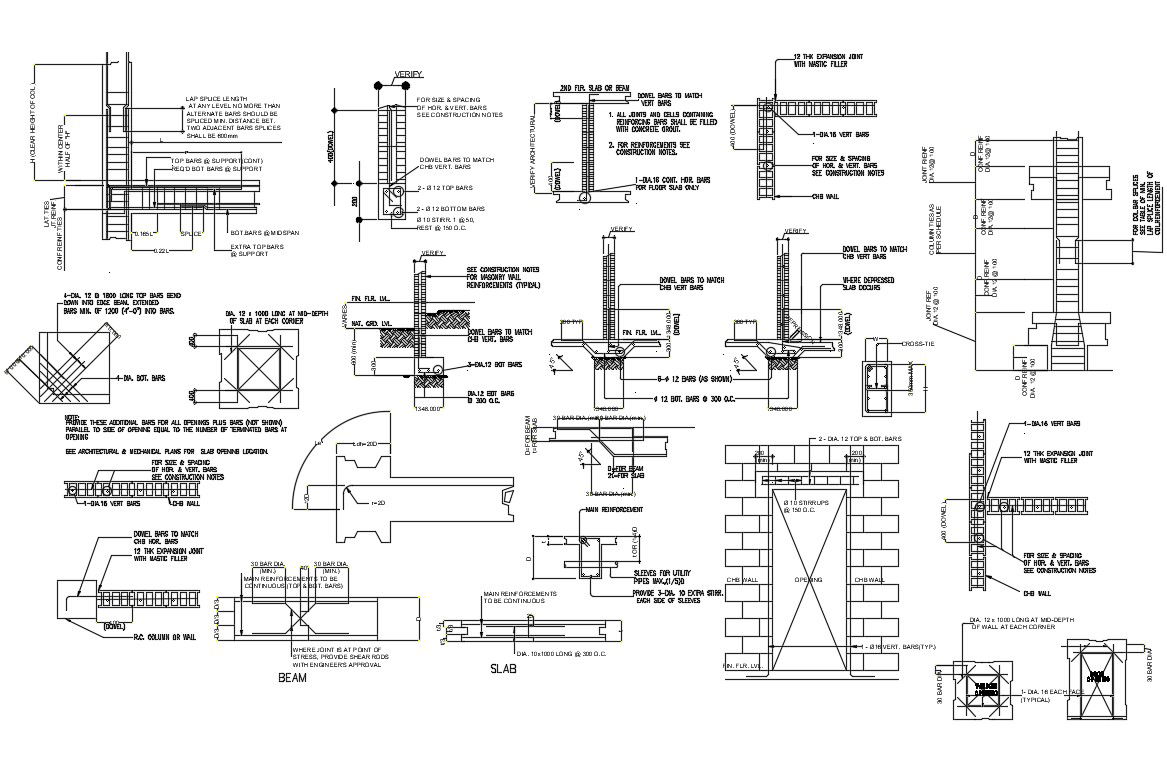 Wall Construction Detail DWG File includes section plan of brick masonry wall construction, slab plan details, and main reinforcement continues detail with description details.