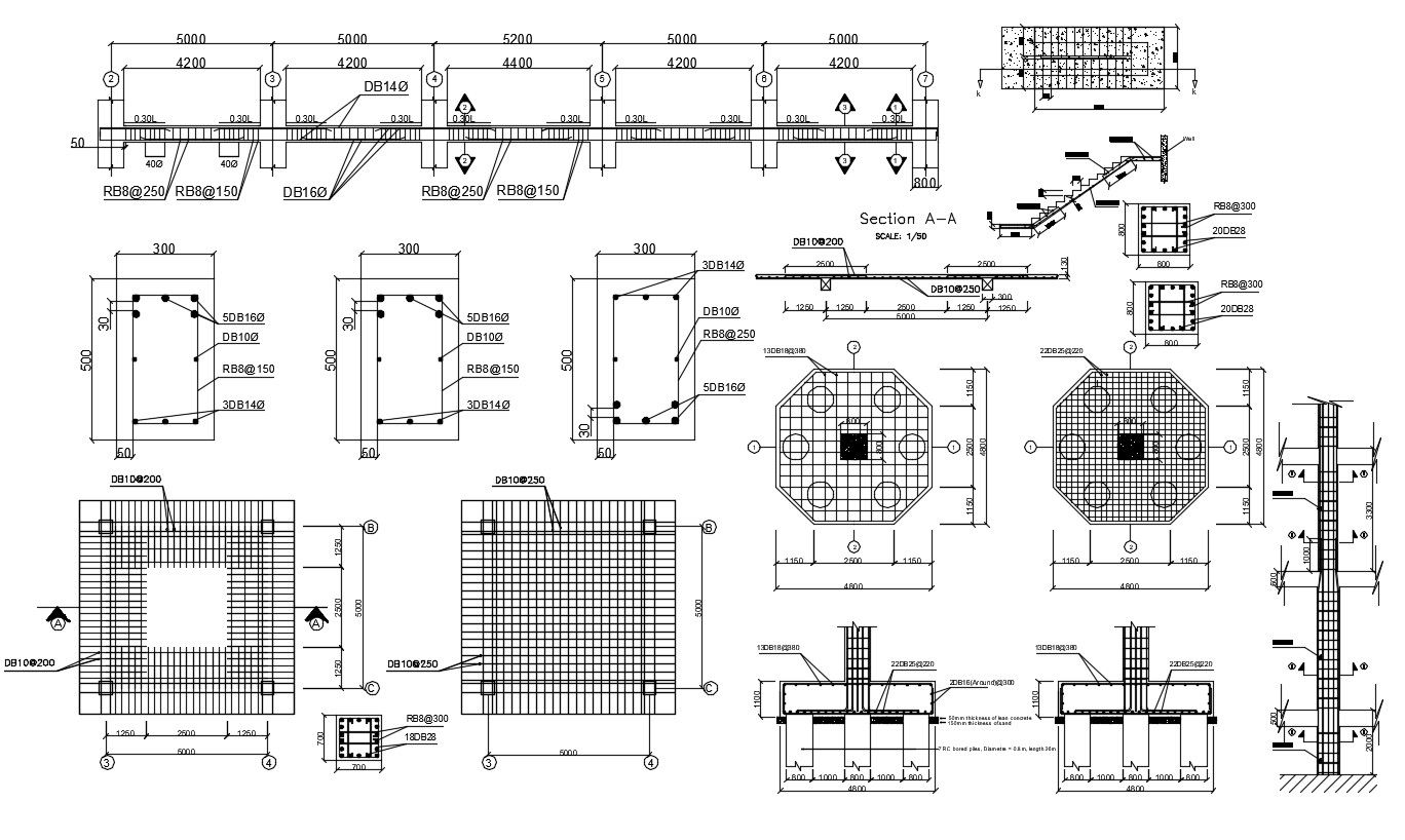 Beam And Column Detail DWG File; section plan of staircase, column and beam details with dimension and description details.