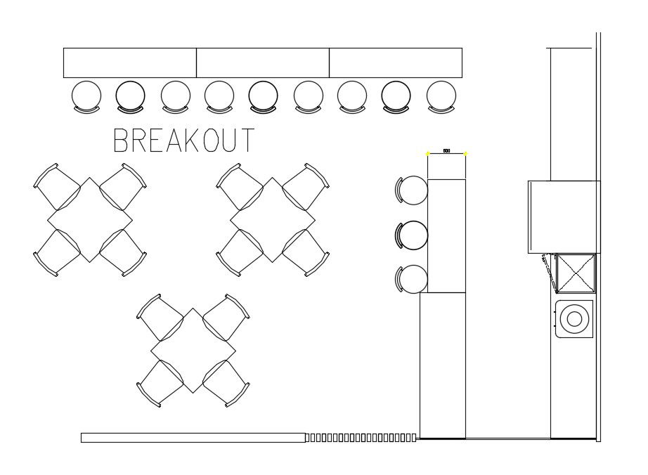 breakout cafe plan DWG file includes a dining area and seating area with furniture detail. download free AutoCAD file of cafe plan and use for multipurpose CAD presentation.