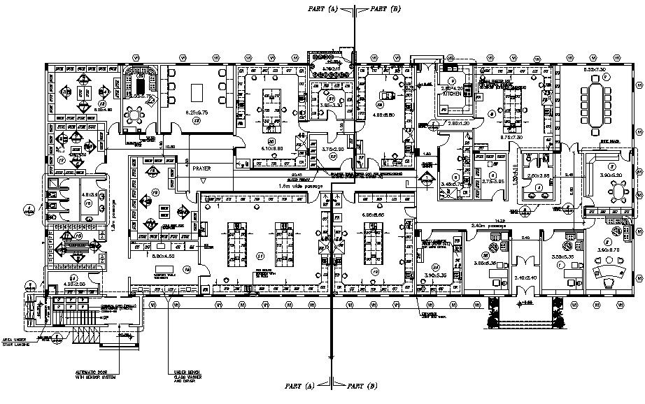 Commercial office building hub CAD plan that shows work floor plan drawing along with furniture blocks details and room dimension details. Ramp details and floor level details also included in the drawing.