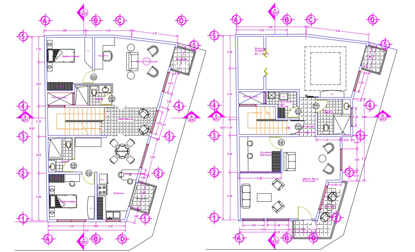 Two storey apartment plan which includes bedroom, bathroom, kitchen, living room, dinning hall, and staircase for the upper floor.