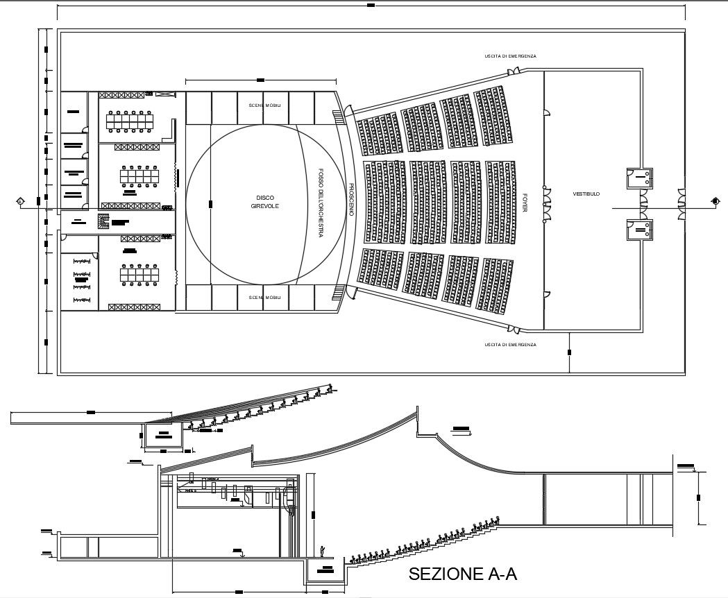 Auditorium Building Plan AutoCAD file includes a top layout plan and section plan. download auditorium plan DWG file and apply this idea at your CAD presentation.