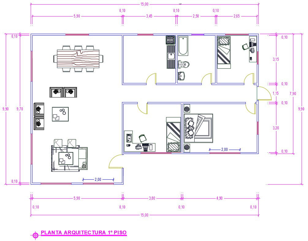 Semi furnished house cad plan that includes two bedroom, kitchen, dinning table, hall, toilet. The length and width of the dimensions given are 9’90 * 15’0.