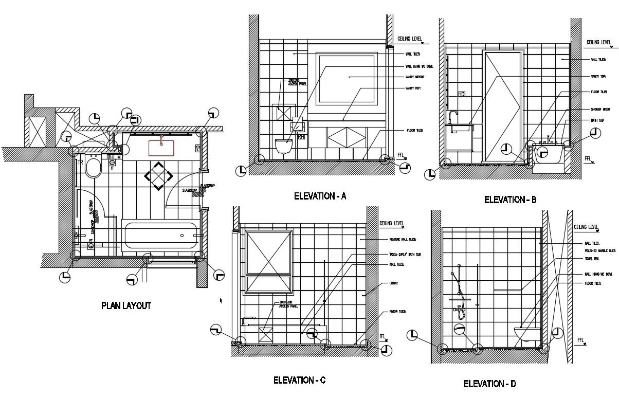 Master Bathroom Plan AutoCAD file; the layout plan includes bathtub, toilet tub, washbasin, and floor details also has all side elevation design in DWG format.