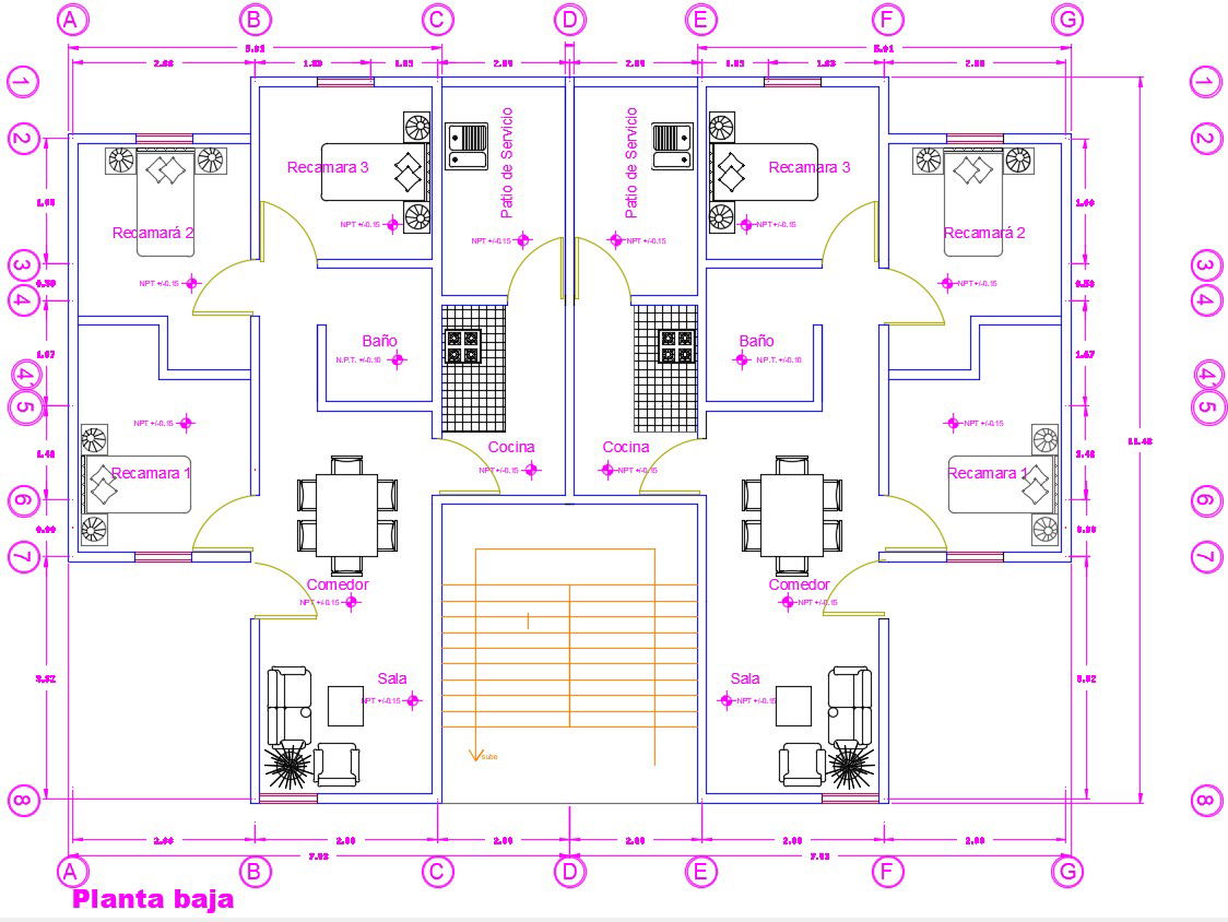 Attached house cad plan which includes no compound wall in the between and includes three bedroom along with the living area, kitchen and bathroom.