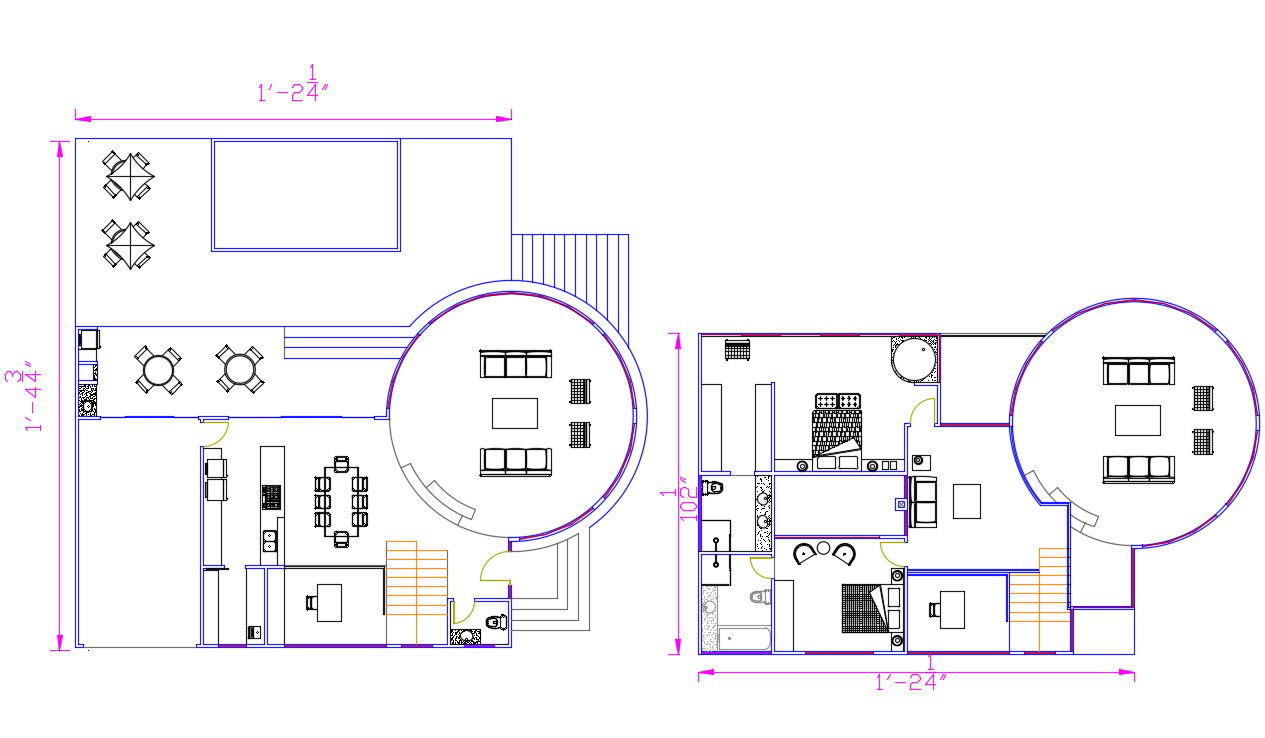 Semi furnished house plan which includes furniture like dinning table, sofa set, bed, wash basin, chairs. There is a ground floor which includes dinning room, living room, kitchen, bathroom. The first floor consists of two bed room, living room, bathroom.
