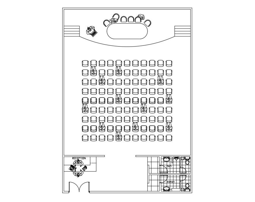 Auditorium Layout Plan DWG File; the layout plan of the auditorium includes seating arrangement, toilet, reception area, and stage with all furniture details.