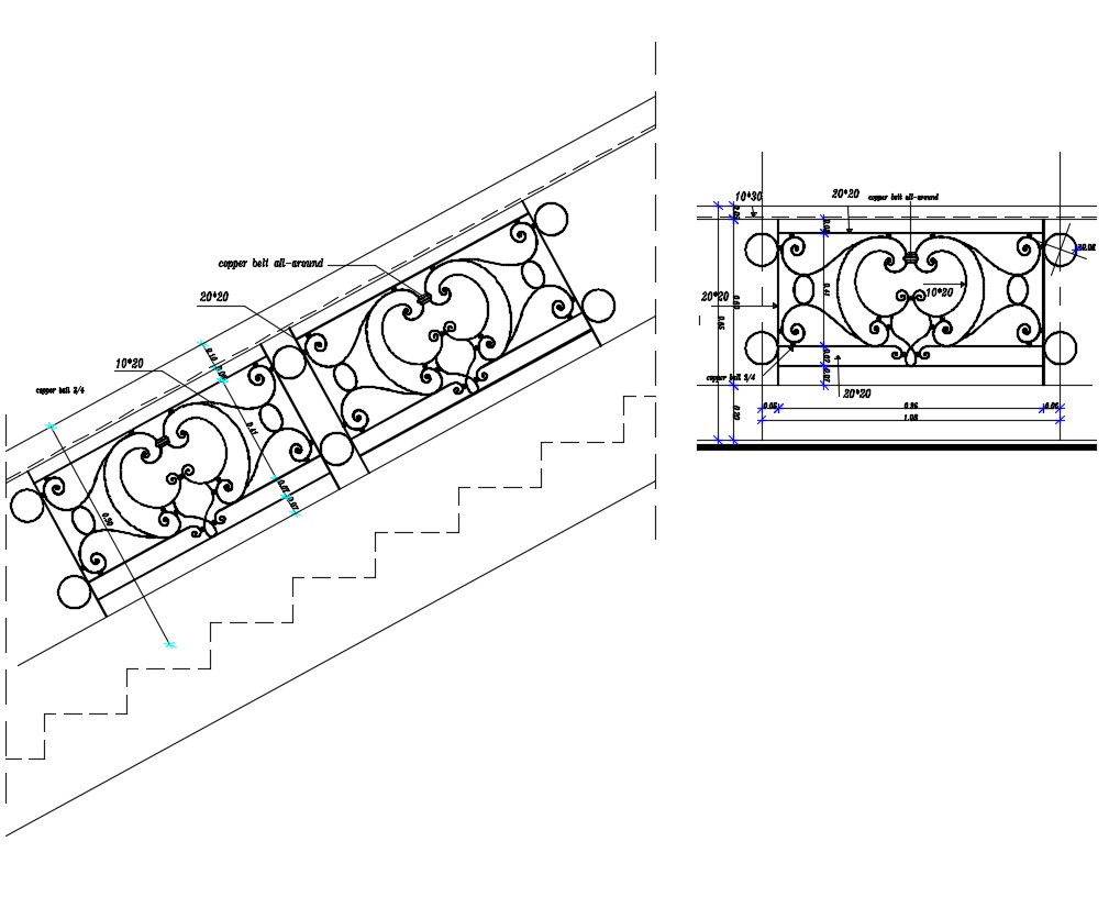 Staircase Railing Design DWG File; includes side elevation design of staircase iron railing design with dimension details. download DWG file and use at staircase CAD presentation.