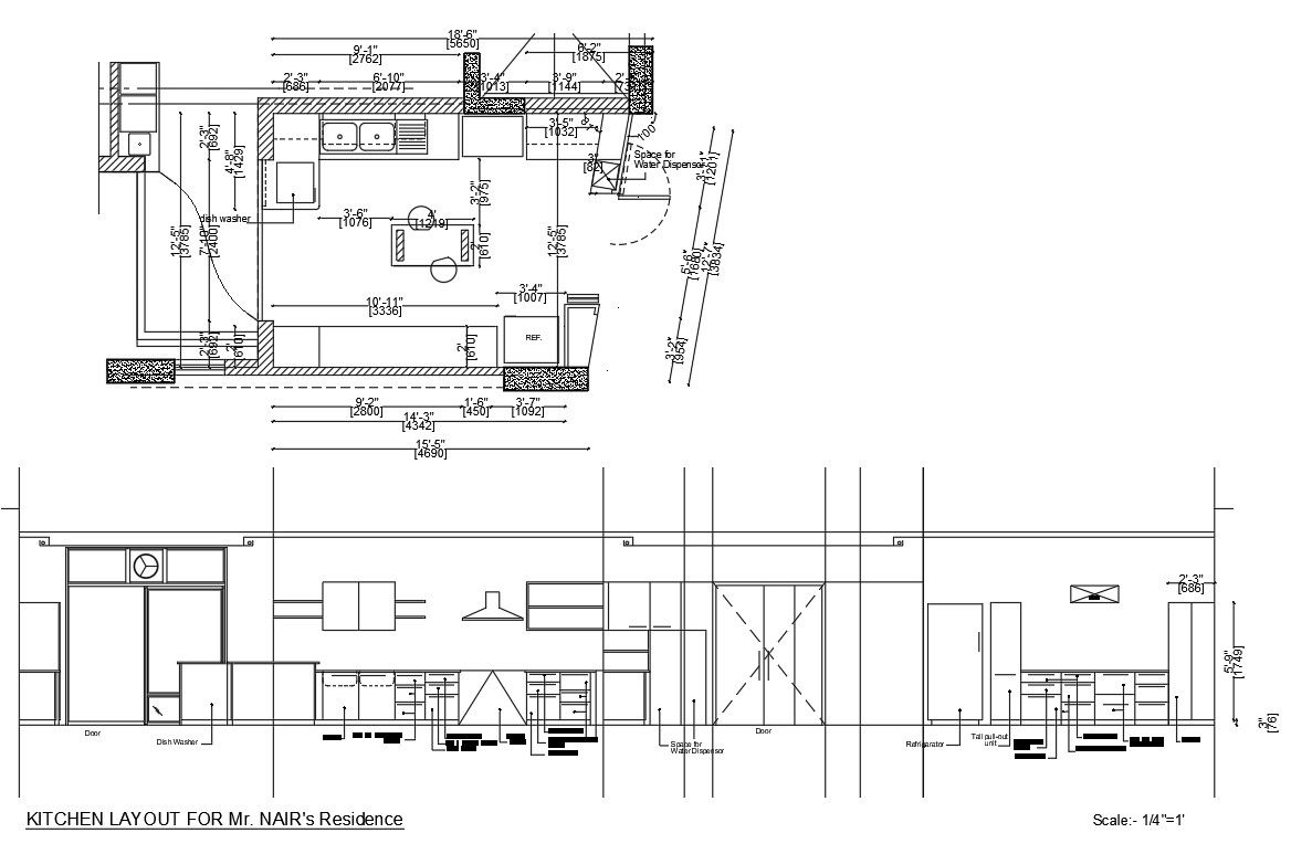 Layout plan of kitchen, section plan and all side elevation design with much more detailing about interior design of kitchen.