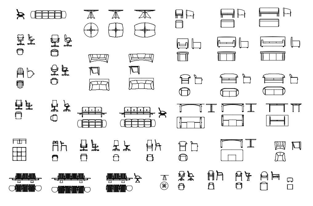 Furniture CAD Blocks Elevation Design DWG file includes armchair, sofa, revolving chair, table, and benches.