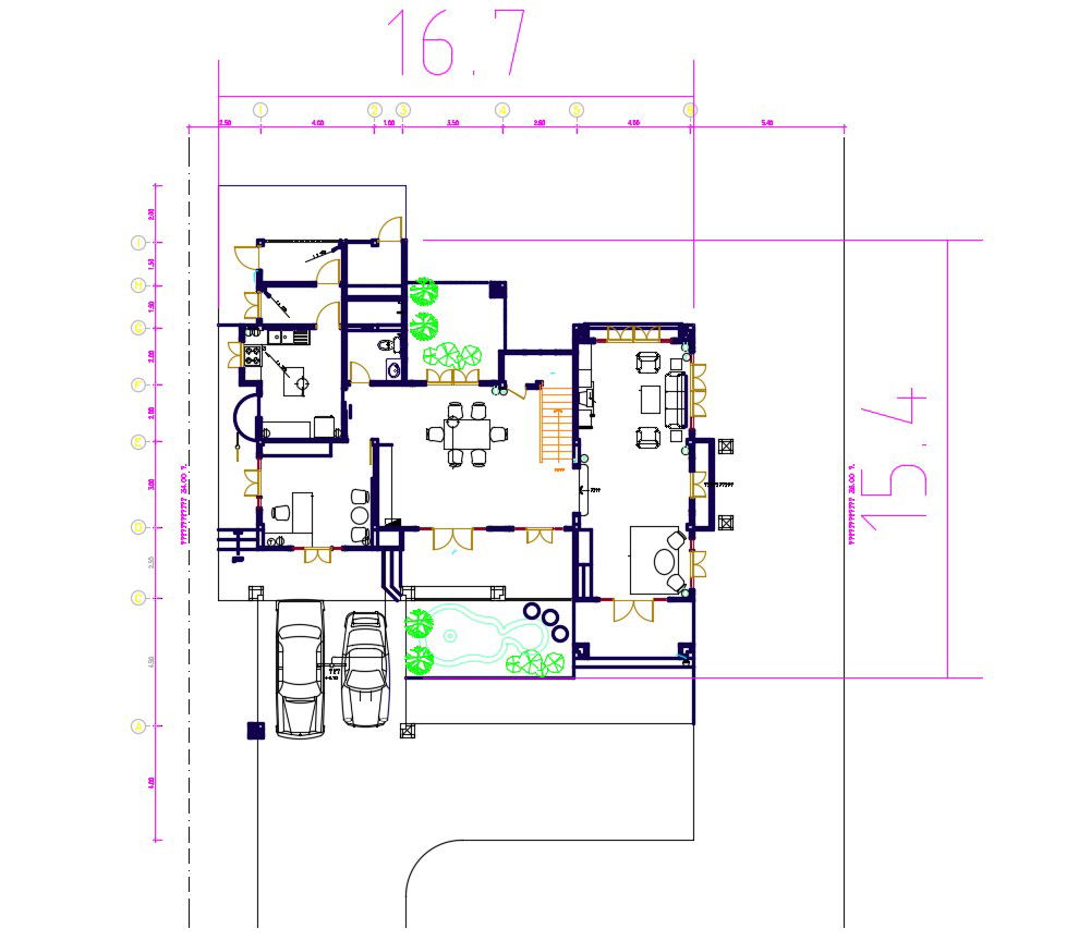 Autocad house plan which consists of one bedroom, kitchen, living hall, wash area, dinning hall, balcony, parking along with the landscaping.