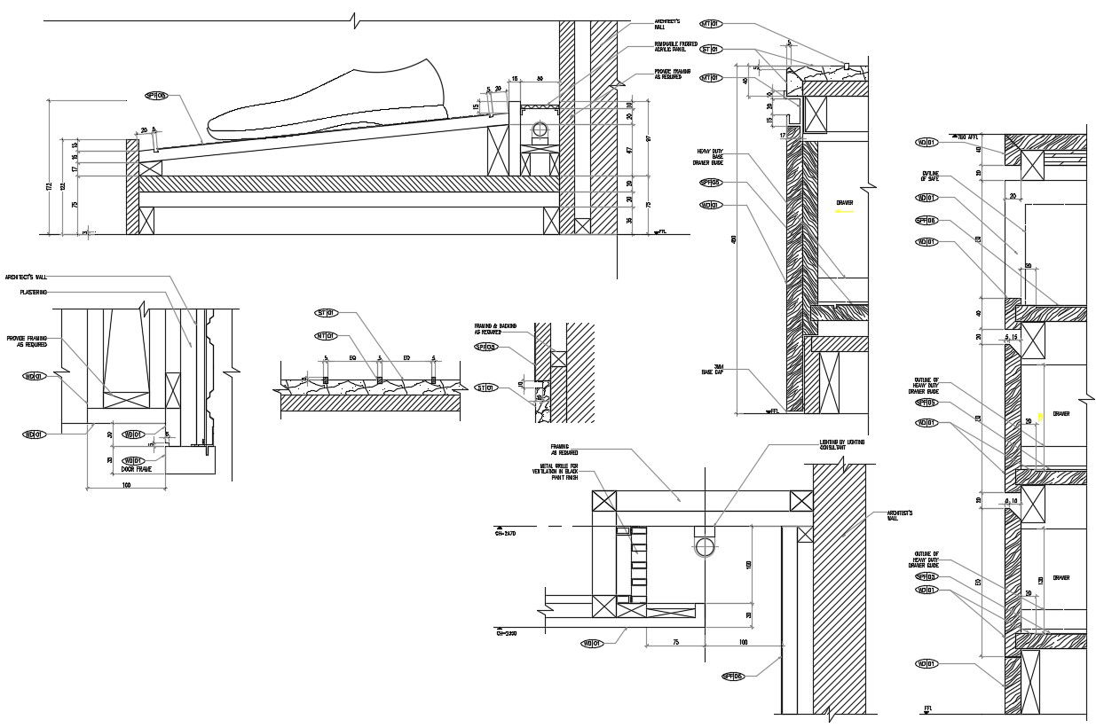 Furniture Cupboard Drawing Sectional details in AutoCAD that shows furniture blocks details of shoe rack along with dimension detail and shelves racks details.