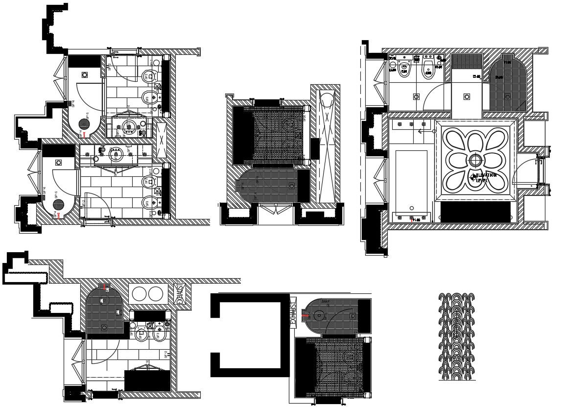 Bathroom Design Plan CAD File Download that shows work plan of sanitary bathroom area along with a bathroom and sanitary ware details of washbasin, water closet, and other plumbing blocks details.