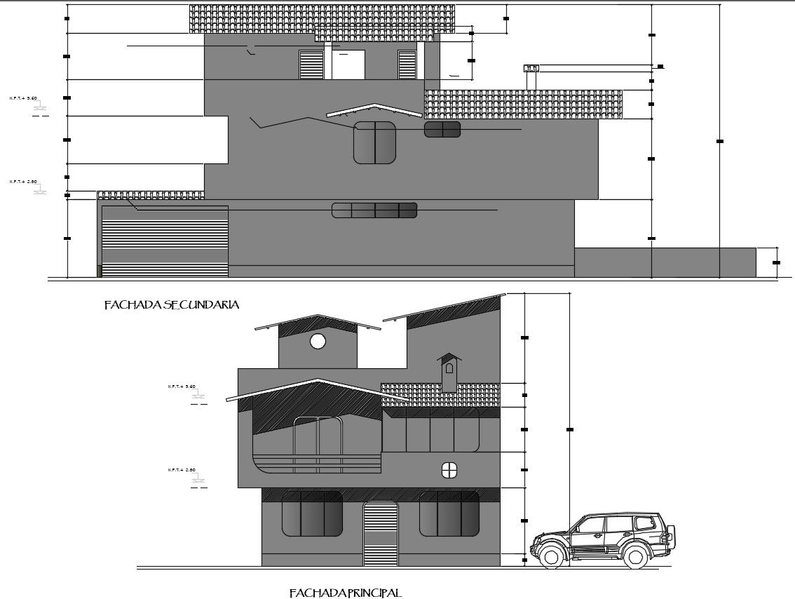 House Facade AutoCAD File; Download architecture residential building facade drawing with dimension detail in DWG format.