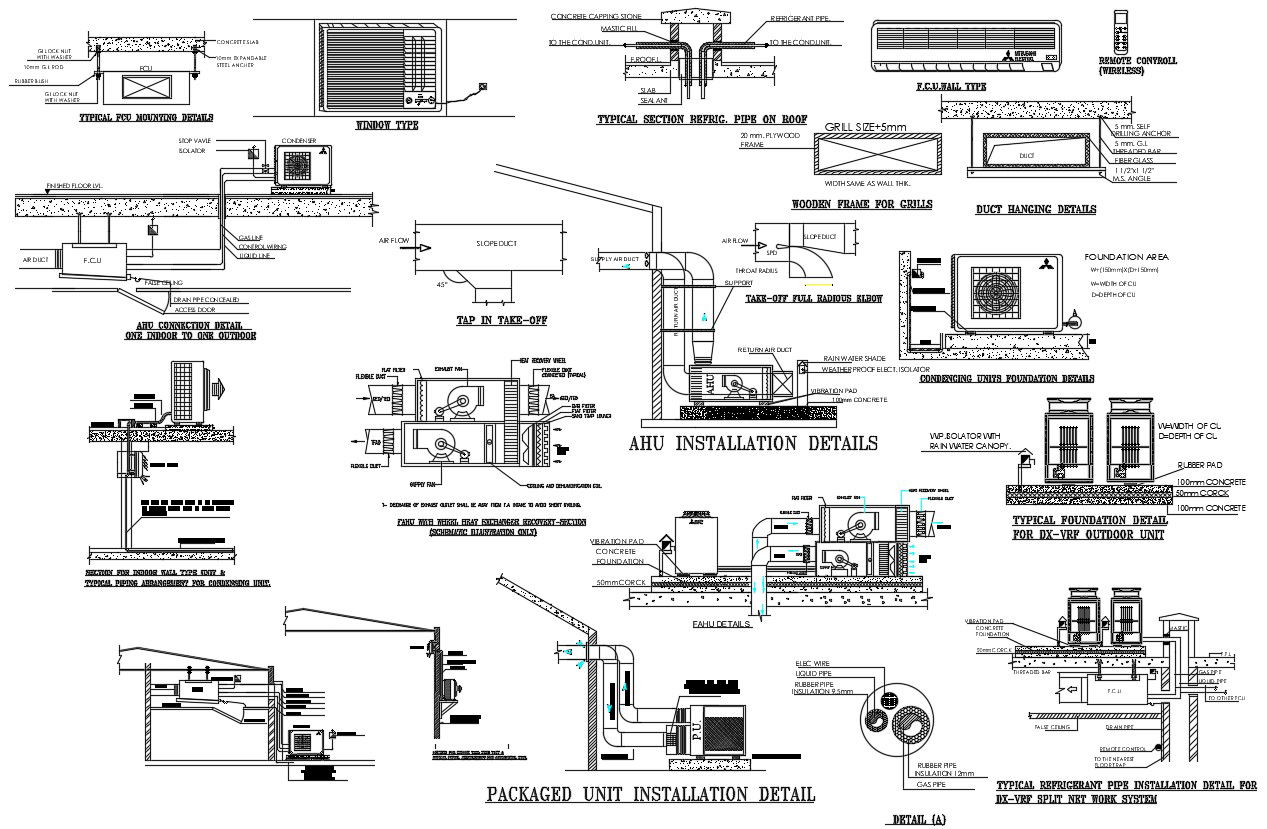 Air conditioning installation CAD details that show Ac vent details along with Airconditioning installation blocks and other electrical units details.