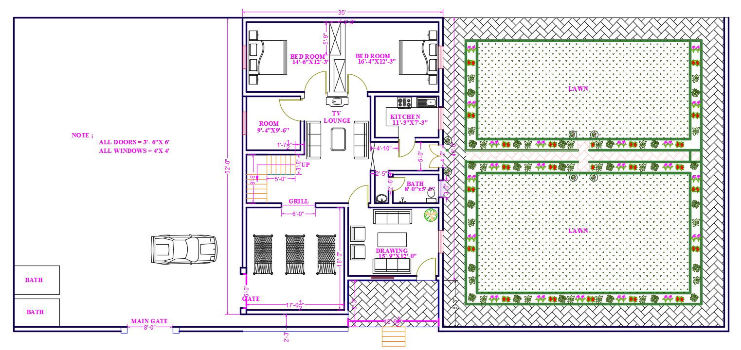 Luxury Autocad bungalow house plan consists of all the details in which big open parking area, restroom, TV lounge, cooking area, sitting room, balcony. In the drawing, it is shown that there are two big sizes lawn area behind the house.