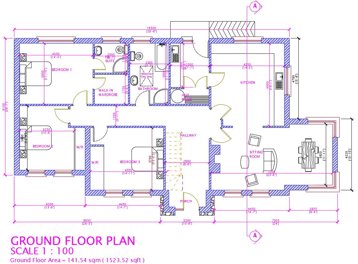 The ground floor plan shows all the details of the bedroom, cooking area, bathroom, hall, sitting room, walkway area. The ground floor area is 1523.52 sqft is also shown.