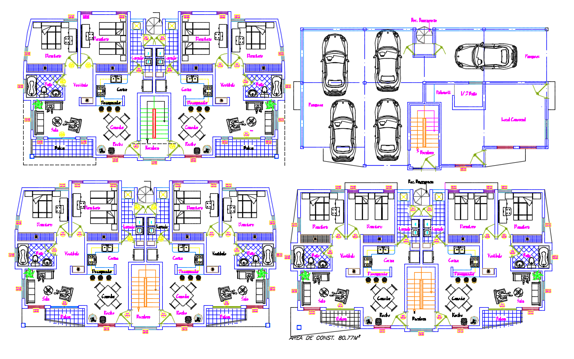 Apartment floor plan includes the ground floor as a parking area. The three-floor apartment includes the details of the bedroom, kitchen, hall, dining area, toilet, balcony.