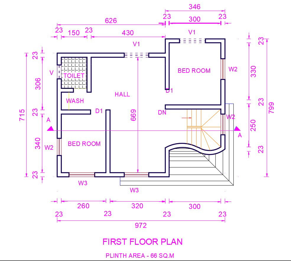 First-floor house cad plan only includes the details of two-bedroom along with the bathroom and a hall area.