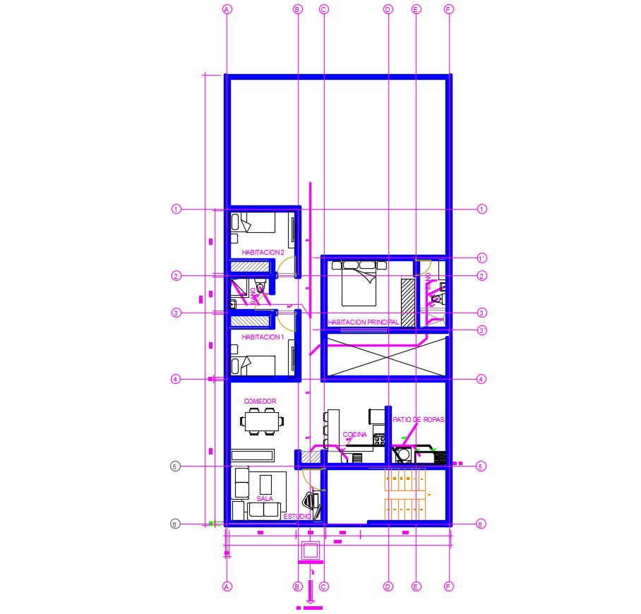 House AutoCAD plan which includes all the details of the bedroom, hall, bathroom, kitchen, E studio.