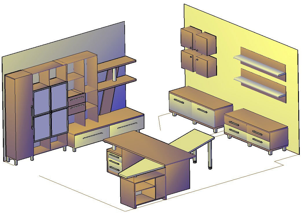 3d furniture model of kitchen units that show furniture blocks design of the cabinet, shelves, refrigerator units, racks, kitchen platform, etc.