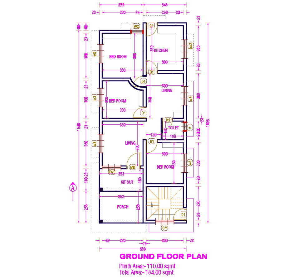 House floor cad plan shows all the dimensions of the bedroom, cooking area, bathroom, sit out area. The total area of the ground floor plan is 184.99 sqft.