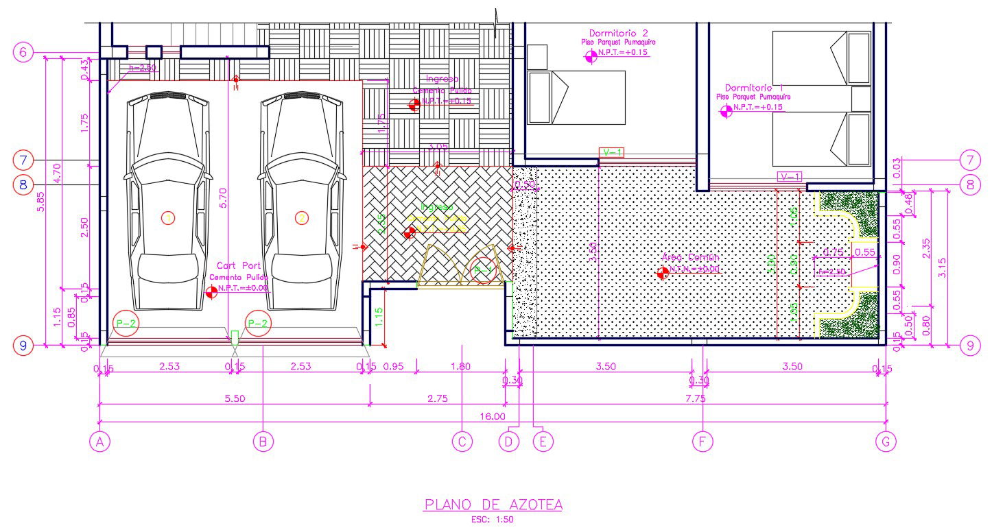The house cad plan drawing shows only the car parking area, bedrooms, and a small amount of landscaping. Expect that all is shown is dimensions.
