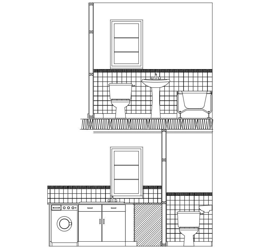 Drawing of Sanitary bathroom section CAD file that shows sectional details drawing of bathroom blocks along with sanitary blocks details of washbasin, water closet, bath-tub, washing machine, and other blocks details.