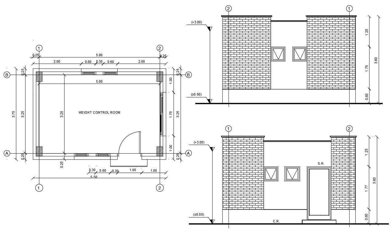 CAD plan of weight control room plan and elevation drawing which shows the room floor plan details along with room different sides of elevation drawing and dimension details.