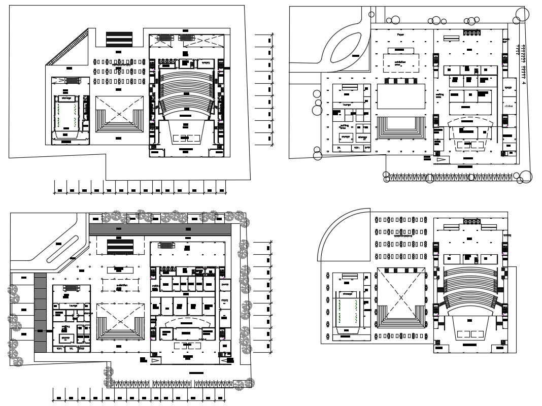 CAD plan of the commercial Auditorium building floor plan that shows the work plan of four storey building along with parking space details and furniture blocks details in building.