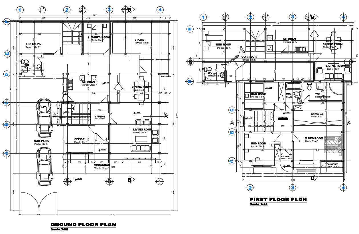 Two storey Residential apartment CAD plan that shows work plan drawing details of housing apartment along with furniture layout details. Dimension staircase and floor level details also included in the drawing.