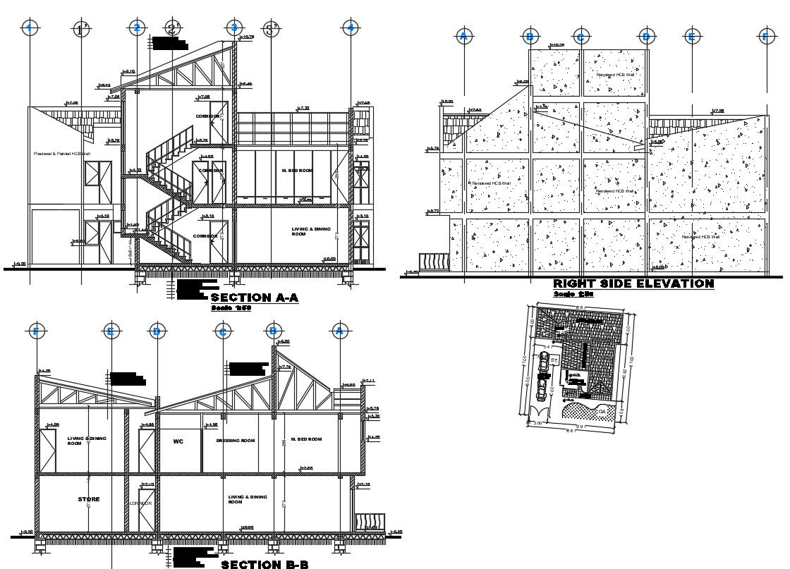 CAD floor plan elevation and section drawing of the apartment that shows work plan drawing of the attic apartment along with building apartment different sides of elevation and sectional details.