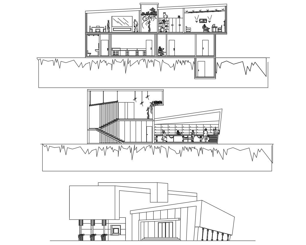 Bank building CAD drawing that shows government bank sectional drawing details along with front elevation of the building.