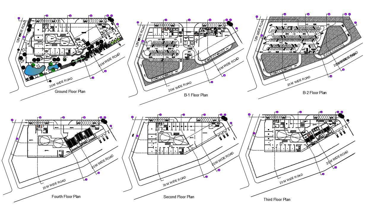 Multiplex Theatre Plan AutoCAD File; the architecture layout plan of basement floor 1 and 2, building floor level detail includes 6 screen theater and sopping floor with description details. download AutoCAD drawing theater plan and get more CAD drawings in DWG format.