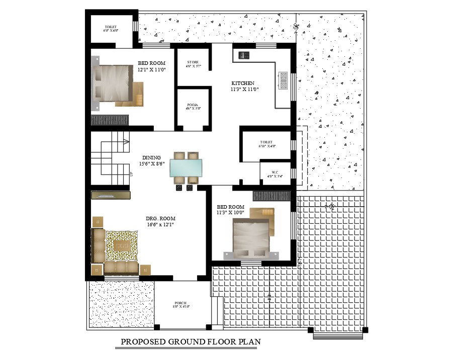 This House Design 2 bed room, kitchen, drawing room, Att. bathroom, W.C, Porch area, And Garden area etc with furniture.