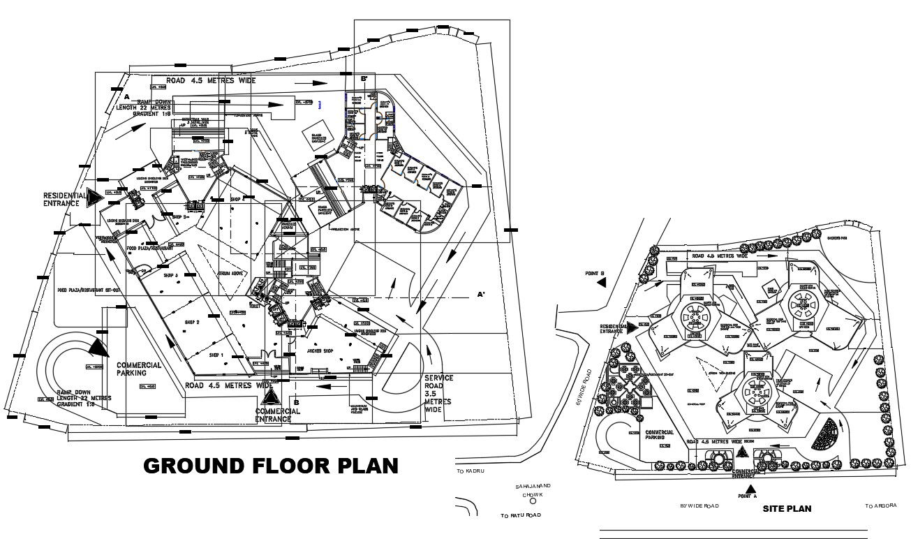 Commercial Building Site Plan DWG File; Architecture AutoCAD drawing includes site plan and ground floor layout plan of commercial building project.