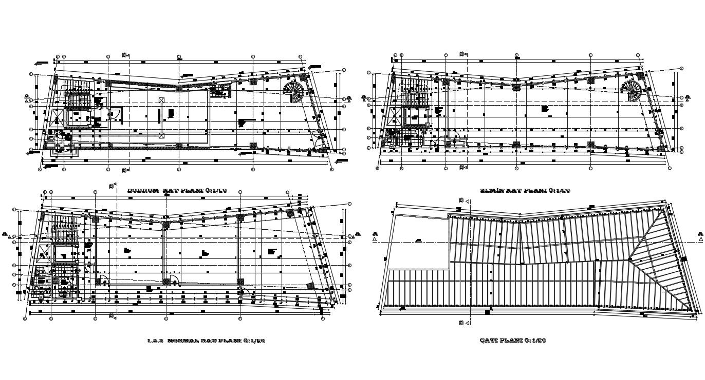Commercial building design CAD plan that shows work floor plan drawing details of building along with dimension hidden line details and floor level detailing.