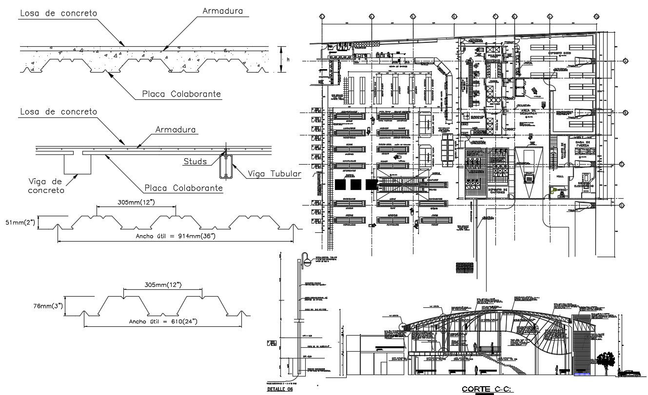 Download industrial building warehouse sectional drawing and plan details along with industrial shed and Curtailment bars details.